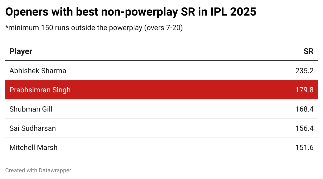 So far in IPL 2025, the 24-year-old has been striking at 179.8 outside the powerplay (overs 7-20). It is the second-best among openers who have racked up over 150 runs outside the powerplay so far this season.