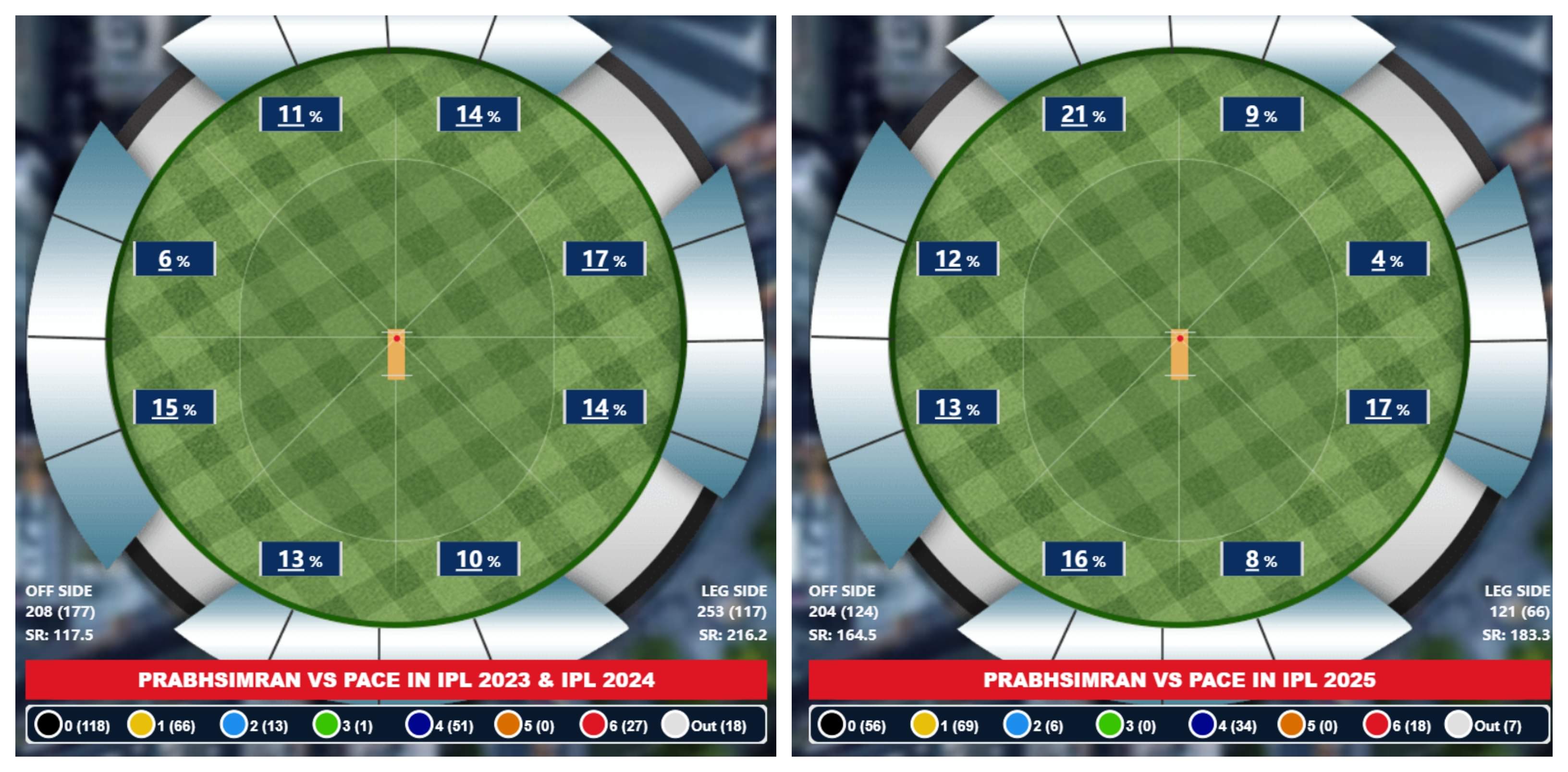 In contrast, so far in IPL 2025, a whopping 63% of Prabhsimran’s runs have come through the off-side. He’s unlocked new scoring areas, and so, unlike previous seasons, teams simply haven’t been able to contain him.