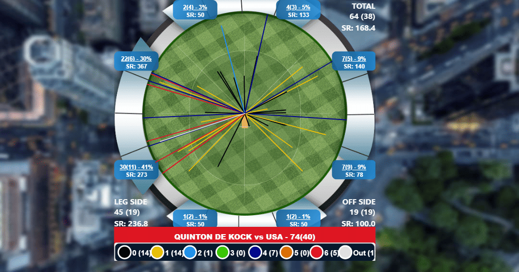 The US pacers also contributed to de Kock’s return to form. They bowled in his radar, allowing him to target his favourite mid-wicket area. The wicketkeeper-batter hammered 47 off 19 balls against pace. Consequently, 71% of his runs came in the mid-wicket and square-leg region, including all five sixes.