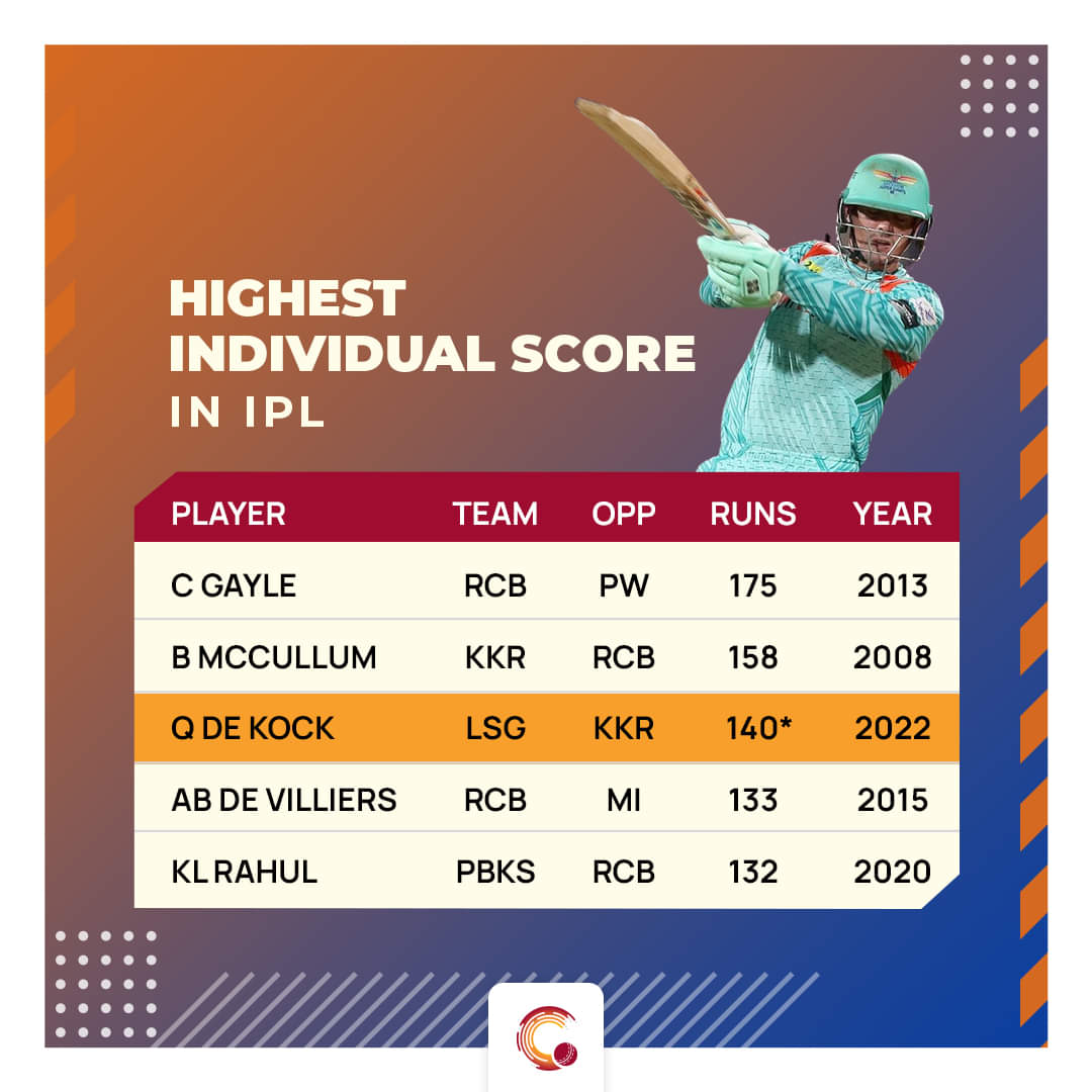 This record-breaking knock was the third-highest score in the history of the league surpassing AB de Villiers's 133 for Bangalore against Mumbai in 2015. Chris Gayle, with his destructive 175 and Brendon McCullum's 158 in the inaugural game of the league, are the top two highest individual scores.