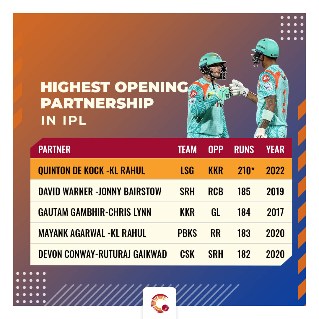 They added an unbeaten 210 runs for the opening wicket, which is the highest partnership for the first wicket in the history of the competition. David Warner and Jonny Bairstow scored 185 runs for the Sunrisers Hyderabad against the Royal Challengers Bangalore in 2019, which is the second-highest.
