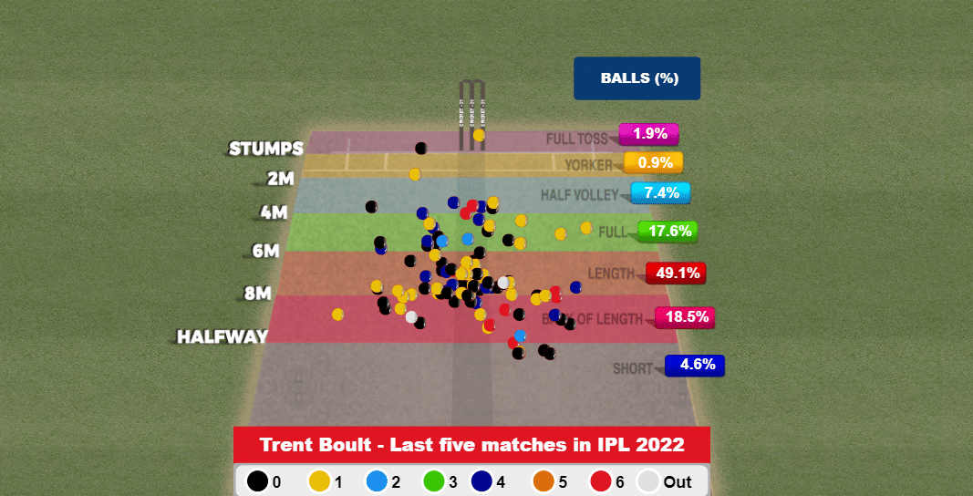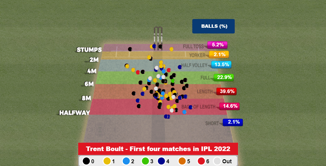 In his first four matches, Boult tasted a lot of success bowling full (2-6m), picking up four out of the seven wickets, bowling over 36% of his wickets bowling in that area.