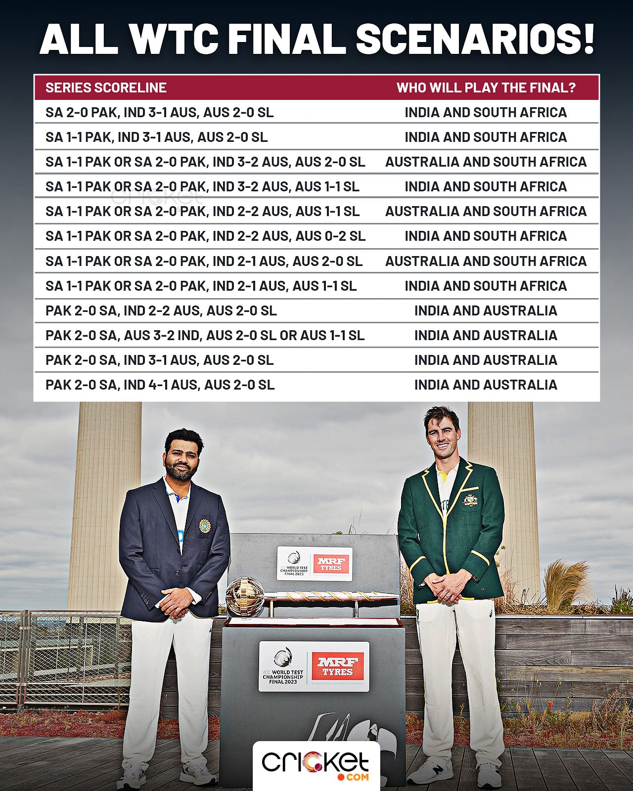 Again, even if AUS whitewash SL 2-0, their PCT will still be only 57.01%, meaning IND & SA will play the final. So all have SA to do is win one Test against PAK, which will guarantee them the top spot even if IND win BGT 3-1.