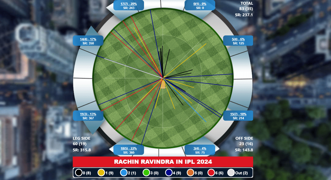 For every ball on the leg-side or slightly targetting his body, Rachin was like give me more. In 19 deliveries that he has attempted to hit on the leg-side, his score reads 60, and his strike rate is 315.8.