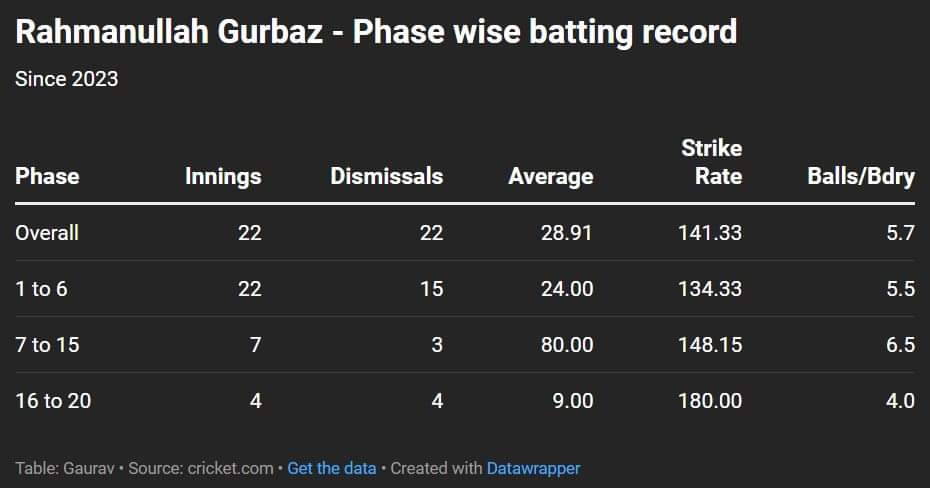 That’s why someone of Gurbaz's ability, whose defensive technique (at least on the balls that move into him) is solid enough to bat throughout the innings, gets out a lot in the powerplay itself, trying to accumulate quick runs as the other end is mostly dry.