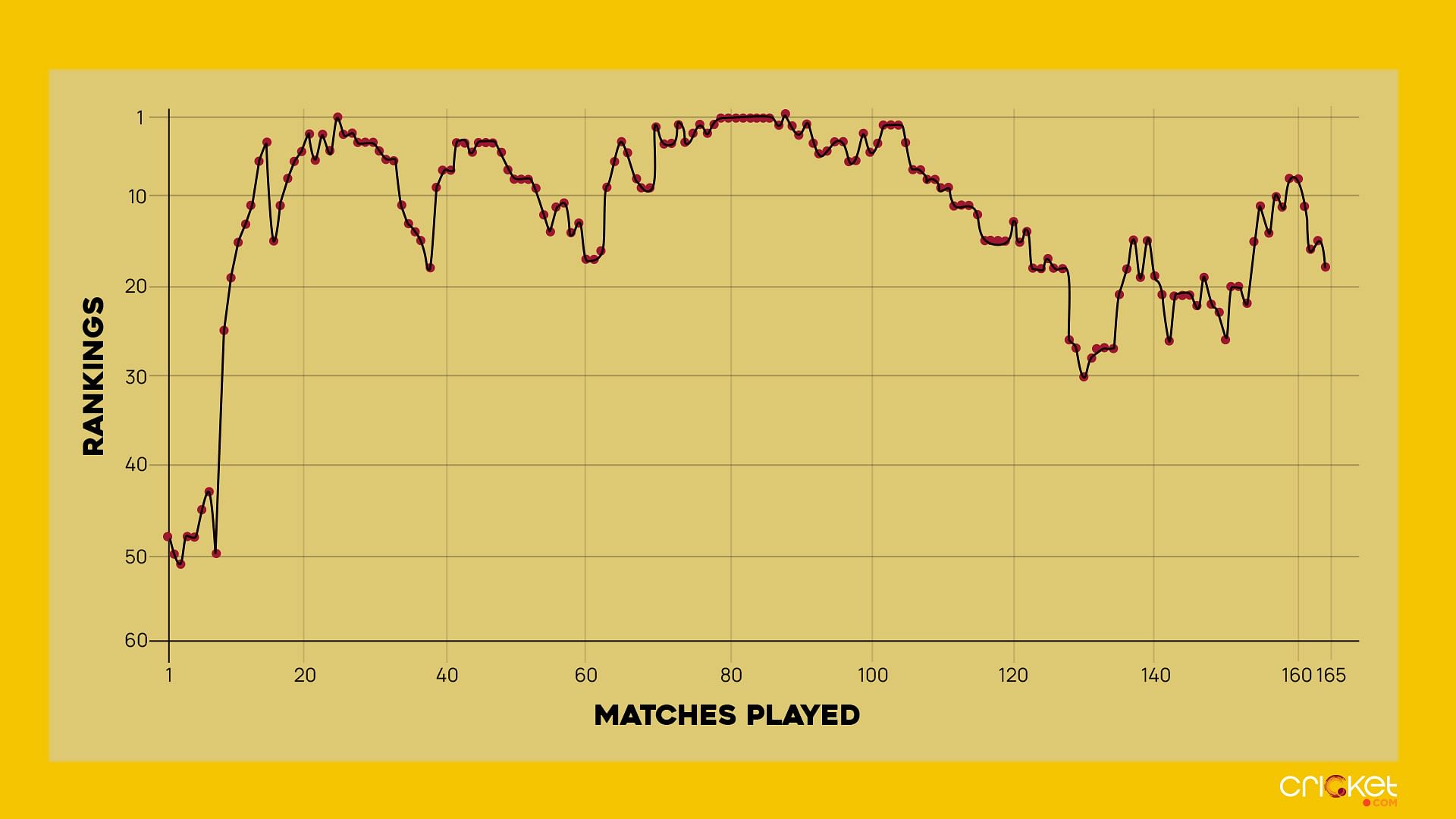 Although Dravid averaged 54.5 during these 20 Tests, he wasn't himself. Recognized by his overseas performances, Dravid averaged only 37.1 away from home as compared to 78.6 at home. The roller coaster ride can be visualized through his rankings graph below.