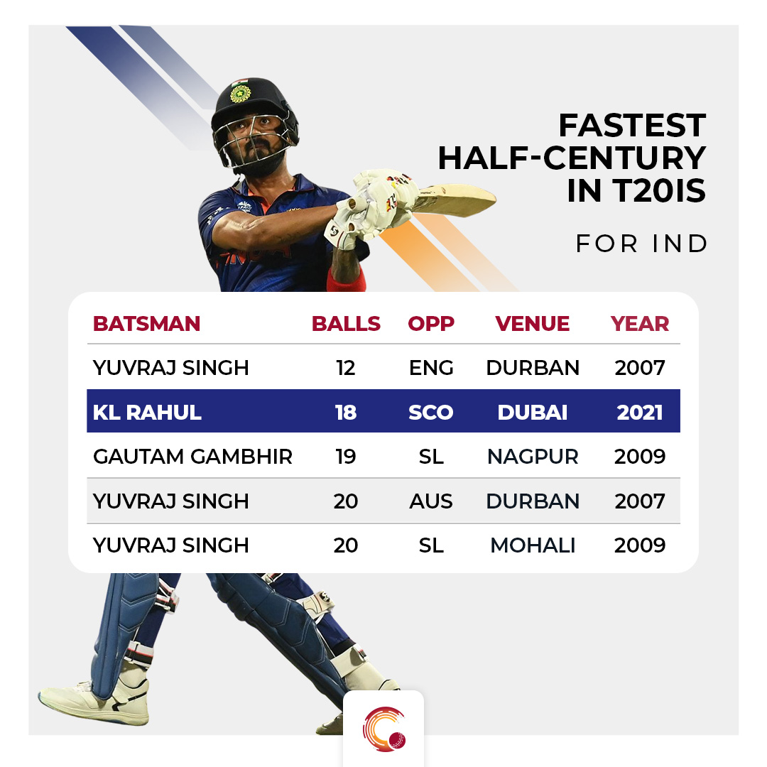 One of the most elegant players in the white-ball format, Rahul displayed an array of strokes all around the ground en route to his knock of 50 in 19 deliveries. The right-handed batter smashed the second-fastest half-century for India in T20Is in 18 balls, which was studded with six boundaries and three sixes to power the Indian team to a massive win. Yuvraj Singh leads the table with a half-century off 12 deliveries in the inaugural edition of the competition against England in Durban.