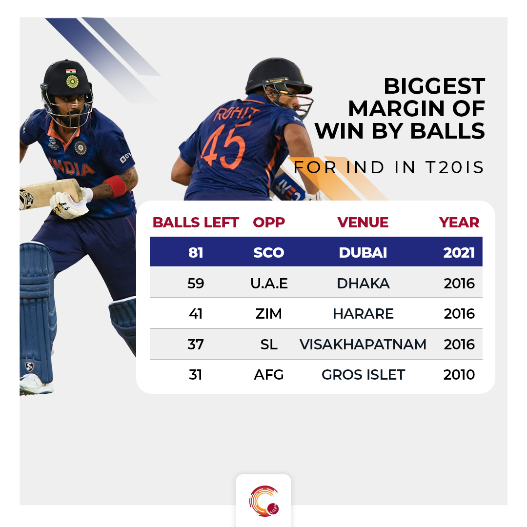 A clinical display by the Indian team resulted in the Indian side clinching the game with a resounding eight-wicket win with 81 balls to spare. The victory is the largest for the side in regards to the ball remaining in this format of the game. In the year 2016, the team chased down a target of 82 runs in 10.1 overs to win by a margin of 59 balls against the United Arab Emirates in Dhaka. In addition, this is the third biggest win for a team in T20 WC. Sri Lanka against Kenya had won by a 90-ball margin in 2007 and Australia against Bangladesh in this edition won by a 82-ball margin win.