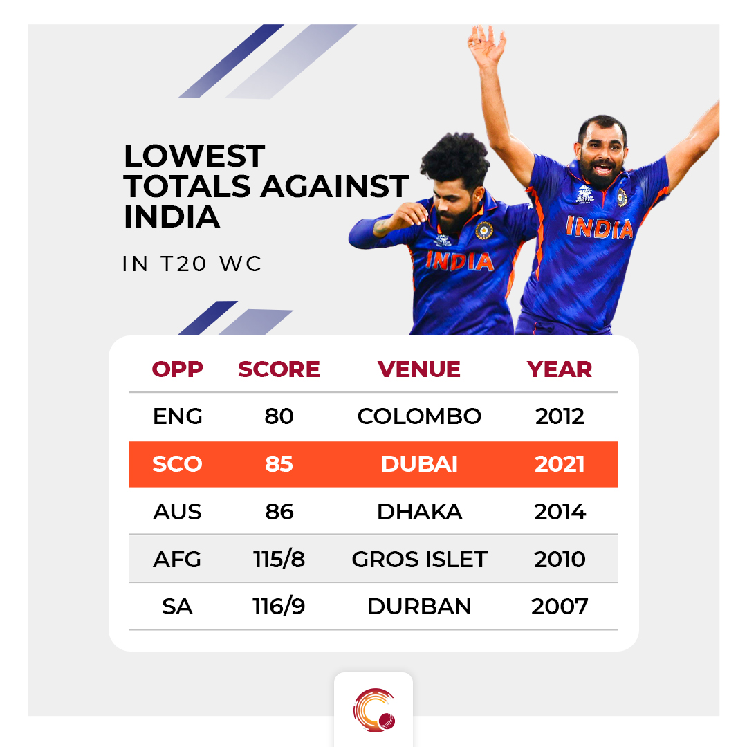 The quality showcased by the Indian bowlers wreaked havoc at the Dubai International Stadium as the Men in Blue produced a commanding performance to dismiss the opposition for 85 runs in the first innings. The below-par performance by Scotland is the second-lowest total by any team against India in the T20 World Cup. In the year 2012, England were all out for 80 at the Premadasa Stadium in Colombo, which is the lowest.