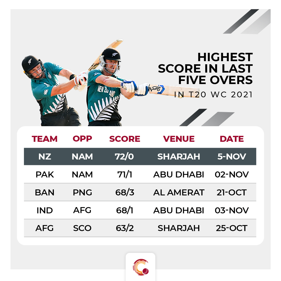 After tottering at 84/4 in 14 overs, New Zealand were bailed out of a challenging situation courtesy of a sublime 76-run partnership by Phillips and Neesham. The duo steadied the innings and accumulated the one and twos before taking the attack to the bowling unit of Namibia. The right-handed batter was the aggressor of the two and smashed an unbeaten 39 off 21 balls studded with one four and three sixes. The pair attacked in the final five overs and scored 72 runs, which is the most by any team in this edition of the World Cup. Earlier in the league stage of the Super 12s, Pakistan scored 71 against the same opposition but lost the wicket of Fakhar Zaman, which is now second on this list.