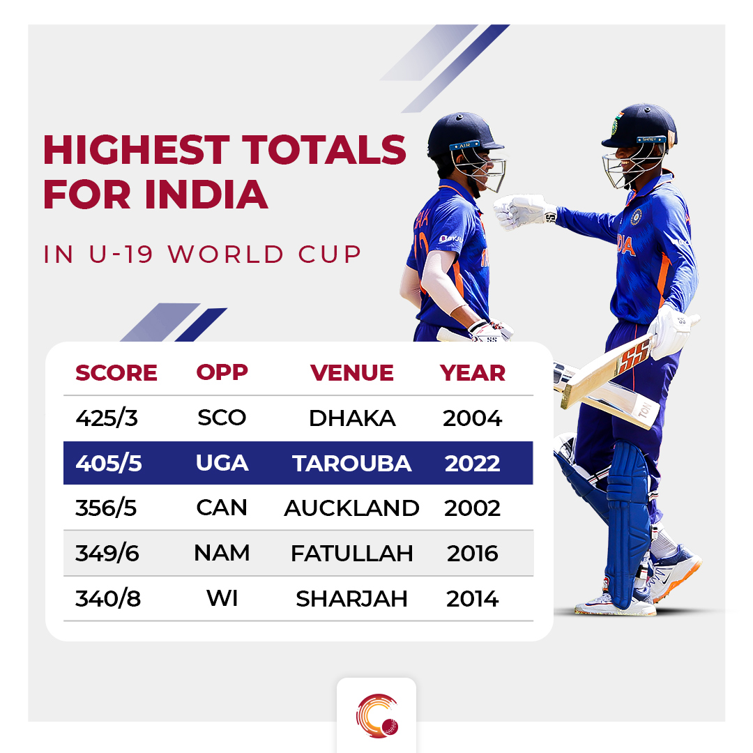 Riding on the back of centuries from Raghuvanshi and Bawa, India managed to post a total of 405/5. This is the second time they have posted a total of 400+ in the U-19 World Cup matches. Their highest total of 425/3 came against Scotland in 2004 in Dhaka, the match Dhawan scored 155. By virtue of it, India became the first team in the U-19 World Cup to post 400+ totals twice. There have been six totals of 400+ in the U-19 World Cup, India twice, Australia, New Zealand, Sri Lanka, and West Indies have achieved this feat once.