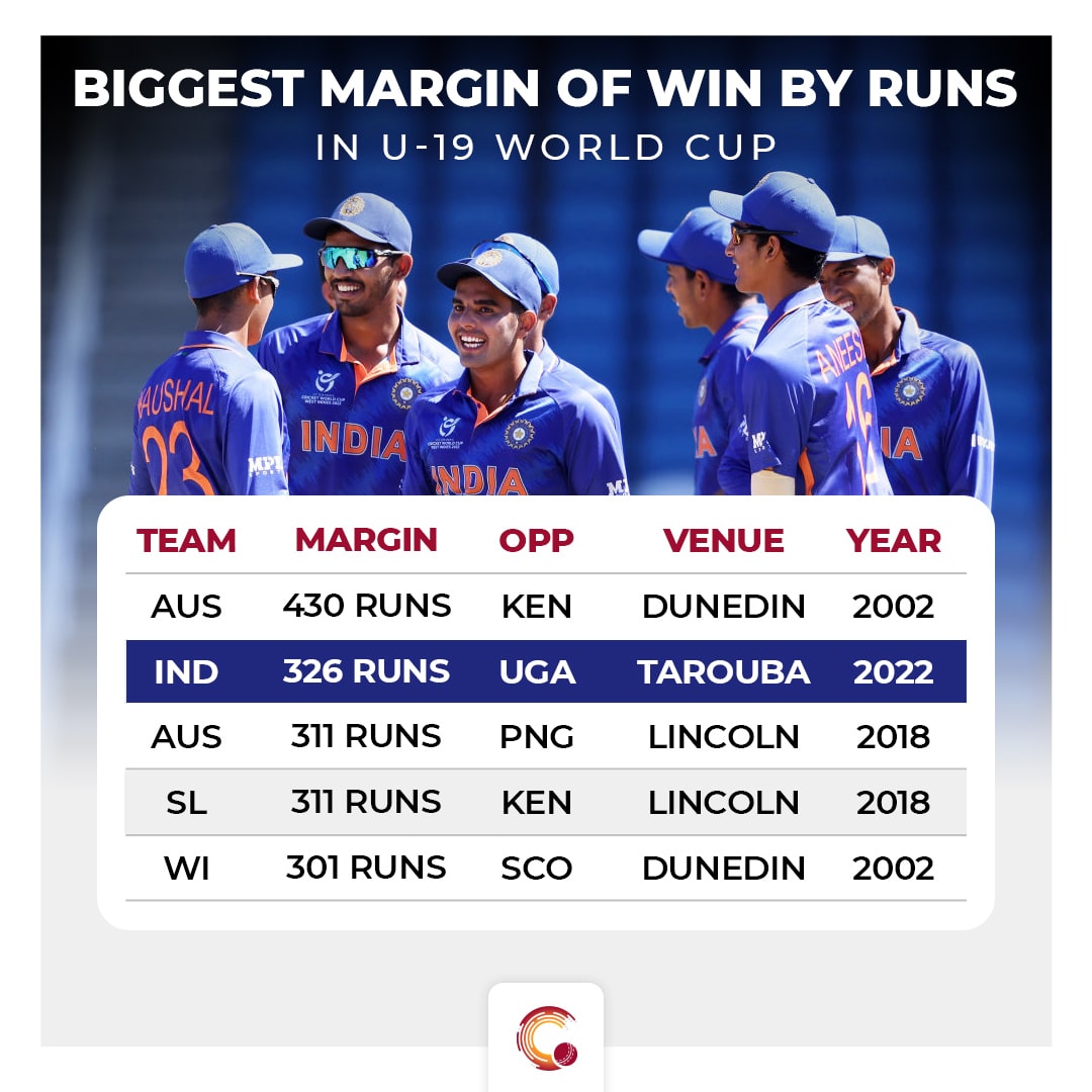 After posting their second-highest total in the U-19 World Cup, India went on to win by a huge margin. The bowling department led by their skipper Sindhu with four wickets, saw Uganda bowled out for a paltry total of 79 and hand India a win by 326 runs. This is the biggest margin of win for India in terms of runs in the U-19 World Cup. Overall, only Australia against Kenya in 2002 had won by a bigger margin – 430 runs – when they had set the highest ever total of 480/6.