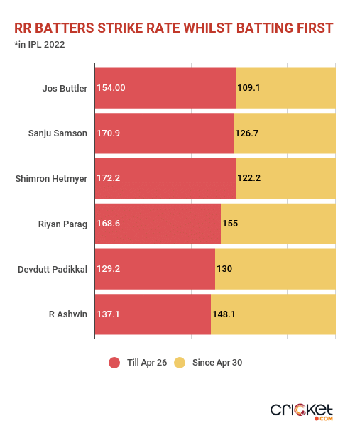 Sanju Samson barely won tosses in the first half of the season, but for the Royals, that didn’t matter; they were winning games left, right and center, batting first. Jos Buttler, Shimron Hetmyer and Samson all were near-unstoppable in the first innings in the first half of the season, and remarkably, each of the Royals’ first six wins came when they batted first.