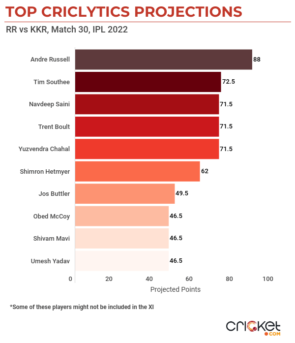 Our Criclytics Player Projector predicts Russell to score 16-24 runs and pick 2-3 wickets