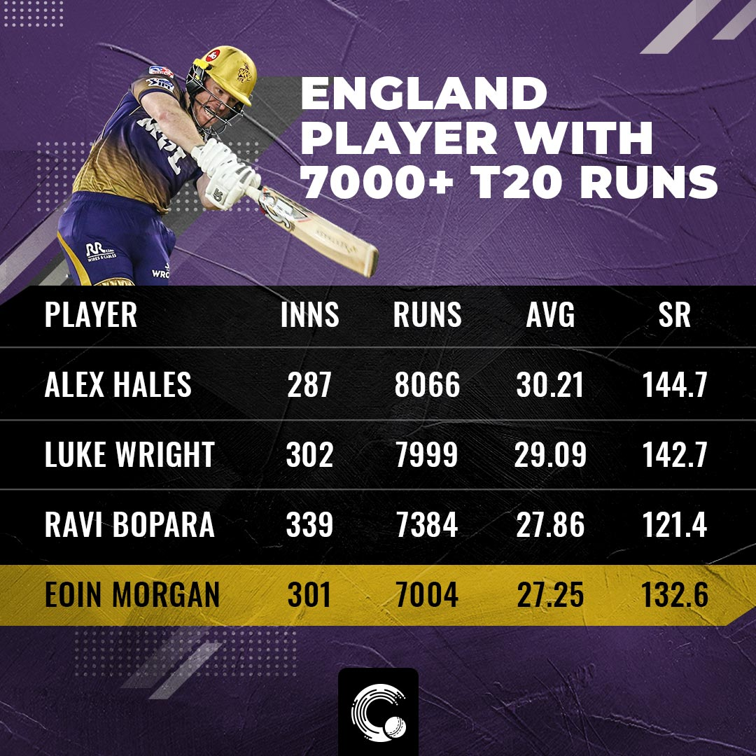 When Eoin Morgan hit Deepak Hooda for a six over long-off, he became the fourth Englishman to reach 7000 runs in T20 cricket.