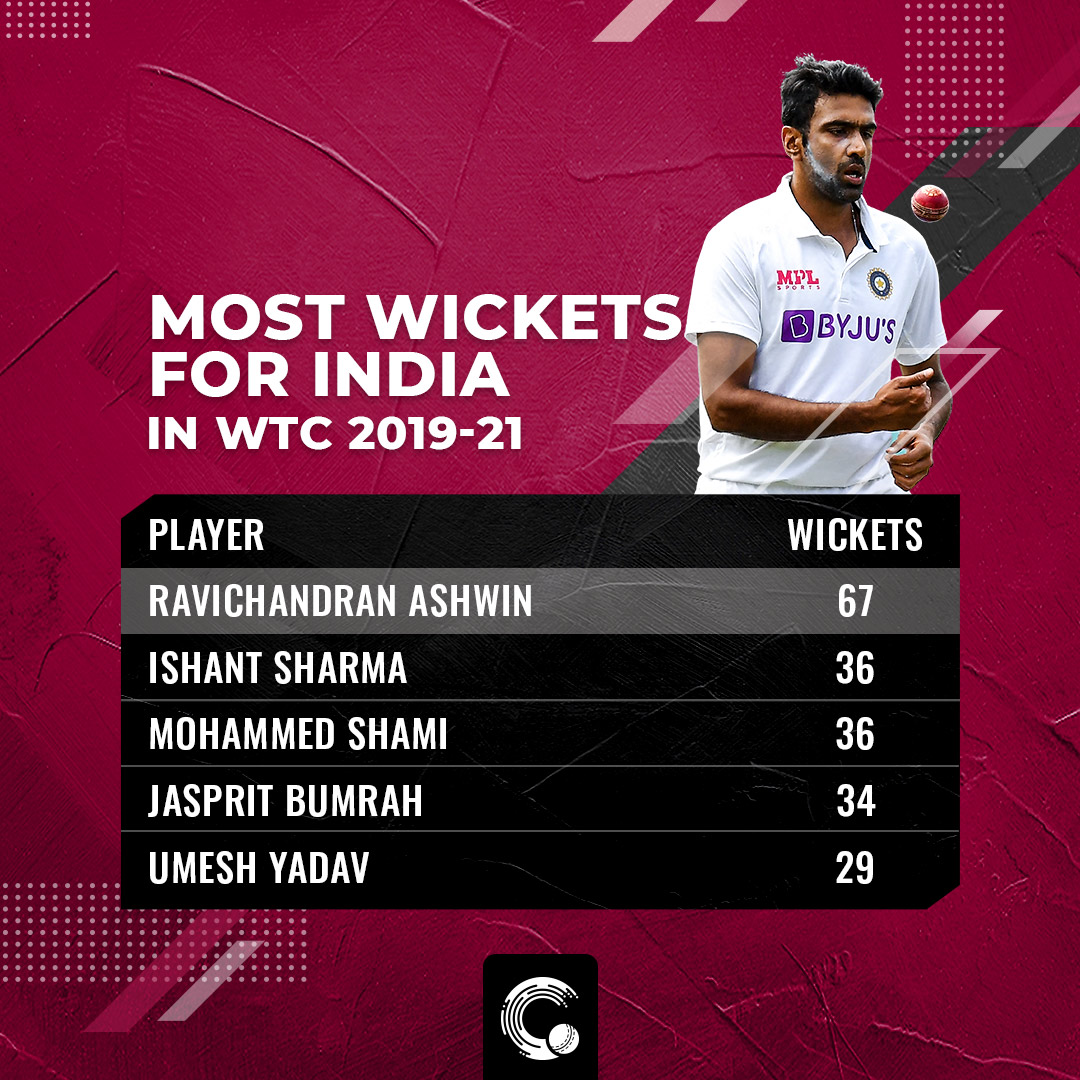 India play the World Test Championship (WTC) final in Southampton with Ashwin as their leading wicket-taker with 67 scalps at 20.88 from 13 Tests. This despite not finding a place in three Tests in the cycle – two against West Indies and one against New Zealand. Not to forget, he also missed the Brisbane Test against Australia earlier in the year due to injury.