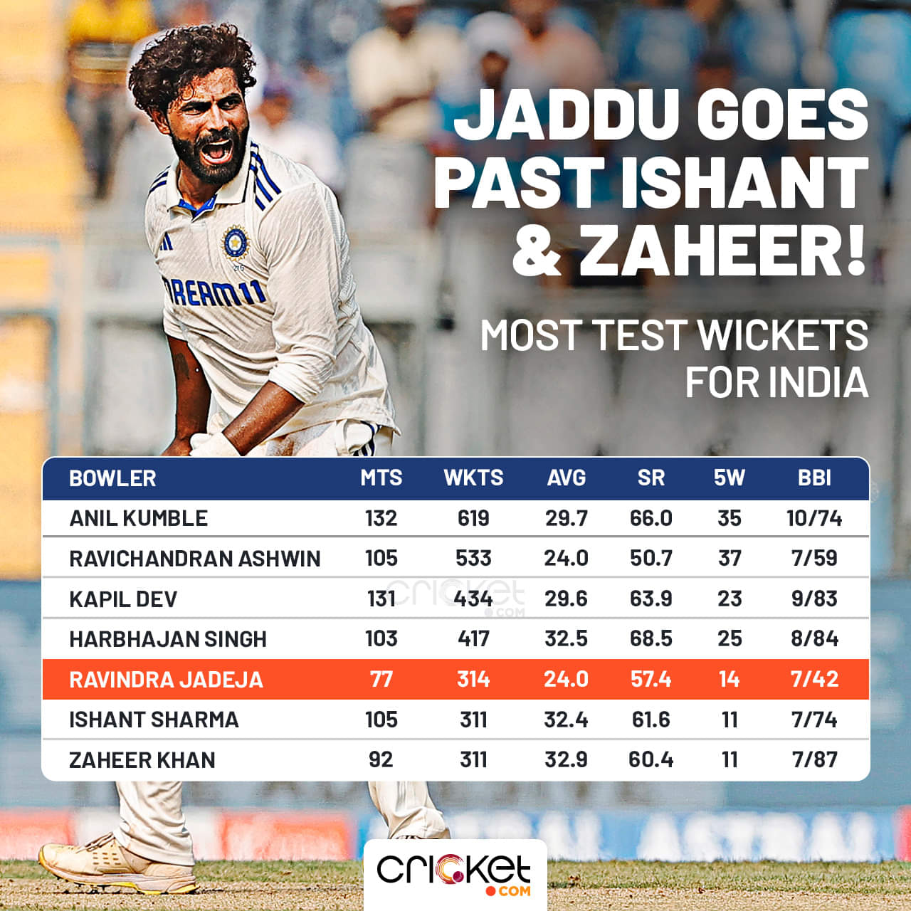 With five wickets in the Mumbai Test against New Zealand, Ravindra Jadeja has become the fifth-highest wicket-taker for India in Tests. He has surpassed Zaheer Khan and Ishant Sharma, who had 311 wickets, to break into the top five.