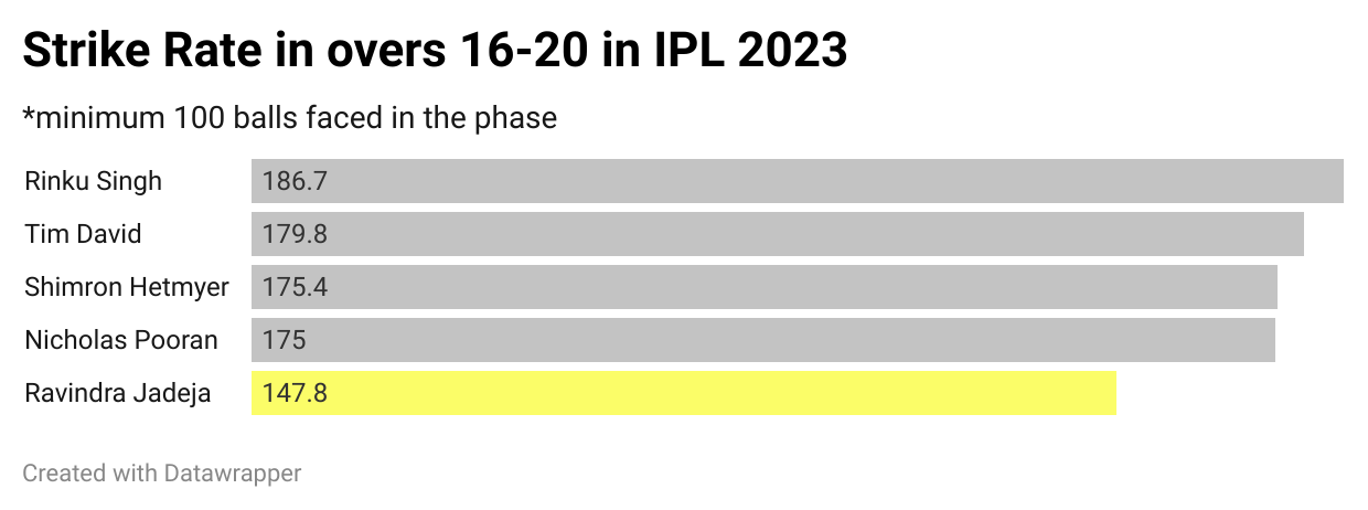 Among batters who faced 100+ balls at the death in the competition, Jadeja was, by some distance, the worst in terms of explosiveness, registering the lowest strike rate (147.8), the least number of boundaries (18) and the worst balls-per-six ratio (13.9).