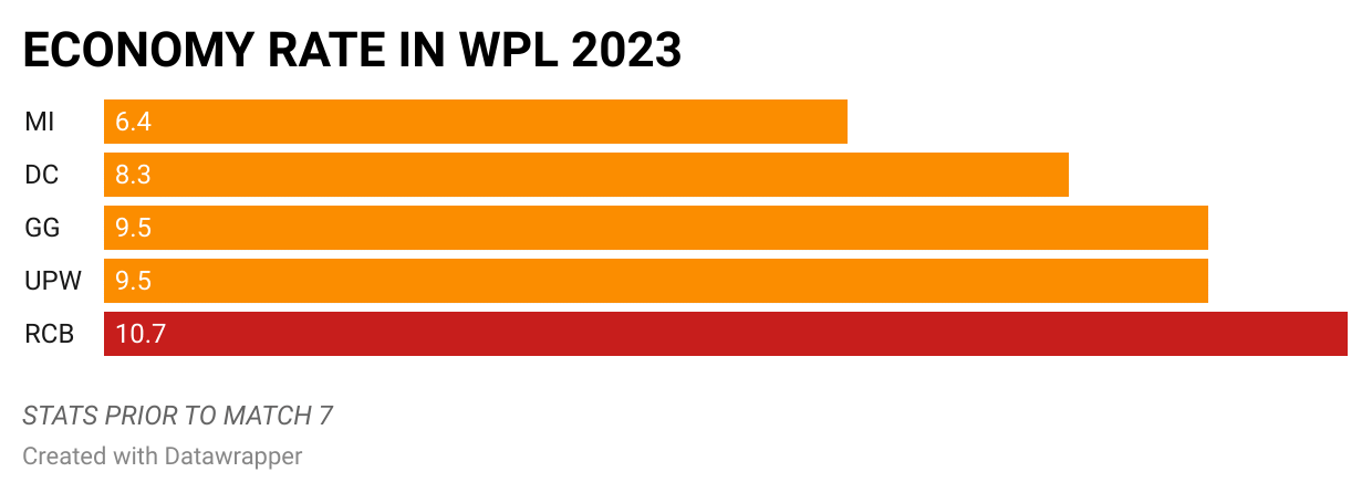 RCB have shown glimpses of brilliance with the bat, but their bowling has been smashed all over the park. In three games, RCB bowlers have taken only nine wickets. Four of them have gone to the part-time off-spinner Heather Knight which tells you a lot about their bowling fortunes. Their economy rate of 10.7 is comfortably the worst in the competition.