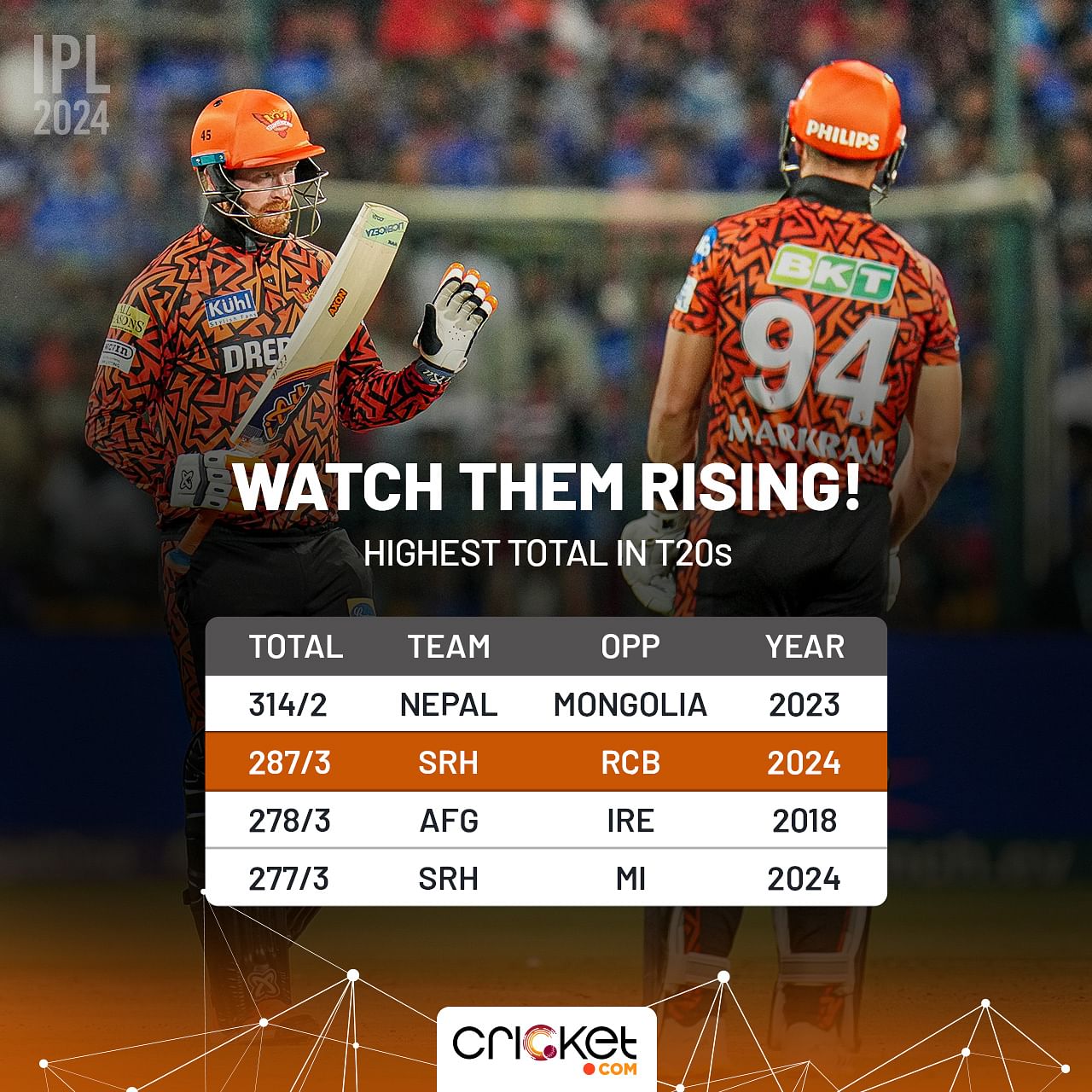 RCB choosing to bowl allowed SRH to come with a fresh canvas and a thought of exploiting the RCB bowlers and sending them to cleaners. Like their captain Pat Cummins who has a history of living up to expectations, the SRH team too lived up to the standards as they demolished their own achievements and became legendary after posting 287/3. While reaching that gargantuan score and playing the match, many records were broken in the game.