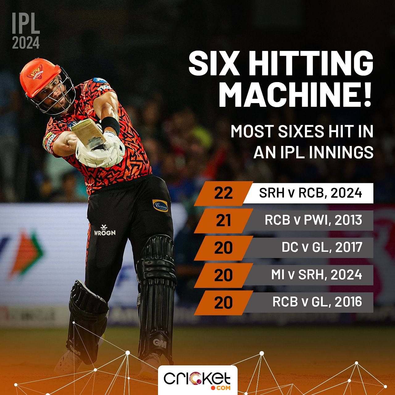 As the innings came to an end, SRH not only posted the highest IPL total. They also smashed the most sixes in an IPL innings as they one-upped RCB’s 21 sixes against Pune Warriors India with 22 sixes. Along with 22 sixes, SRH batters added 19 more fours during the innings totaling the boundary count to 41, which is the second-most boundaries hit in an IPL innings.