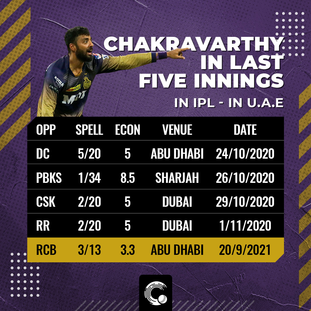 The mystery spinner of the Kolkata unit has been exceptional since last season, especially in the United Arab Emirates. After recording his maiden five-wicket haul against the Delhi Capitals at Abu Dhabi in 2020, Chakravarthy achieved his second-best figures in UAE as he wreaked havoc against Bangalore. The 30-year-old scalped three wickets for 13 runs in his quota of four overs to dent the middle order of Bangalore. In his last five spells at the UAE, he has an economy rate of five or under on four instances.