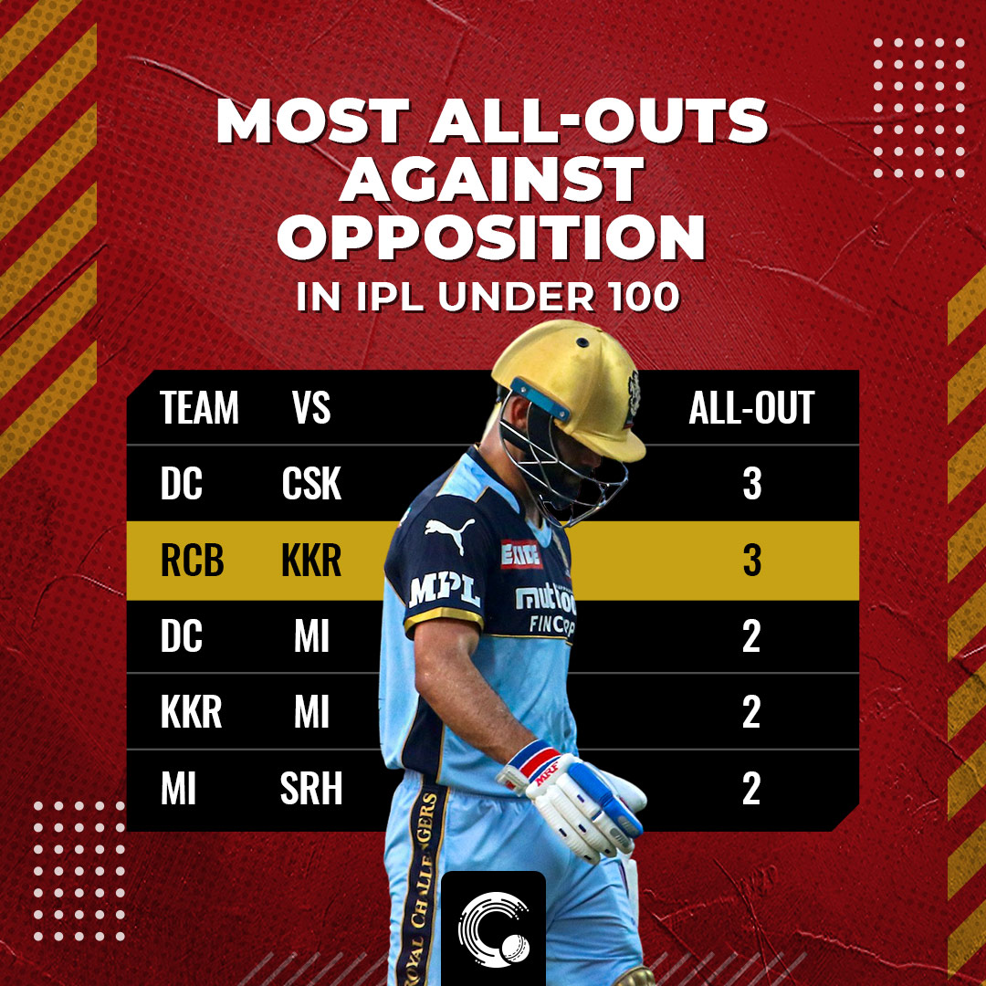 Over the course of the IPL, Bangalore have been dismissed on six instances below the 100-run mark. While the Delhi Capitals are on top of the table with ten matches, Bangalore is second on the list. Out of those six, Bangalore outfit has been all-out thrice within the 100-run mark against Kolkata in the history of the league. This is the joint most for a team against an opposition in IPL. Delhi also have suffered three all-outs under 100 against Chennai.