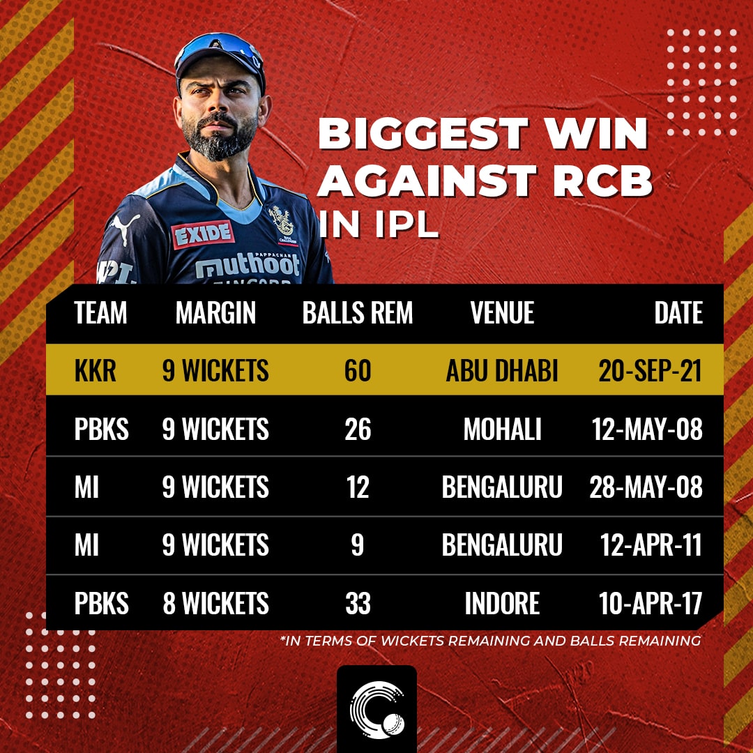 The Bangalore based franchise have suffered demoralizing defeats in IPL against Kolkata. Let be the inaugural match in 2008 or their worst nightmare in 2017 (49 all-out). Yet again, against the same team, Bangalore succumbed to another disheartening defeat. This time it was when they were defending a paltry total of 93. For the first time in their IPL career, a team handed them a defeat with 10 overs to spare and it was none other than KKR. This adds to their list of agonies against Kolkata. Their lowest score (49 in 2017) against Kolkata, their biggest margin of defeat by runs (140 runs) against Kolkata and their biggest margin of defeat in terms of balls remaining or wickets in hand is also against the same team.