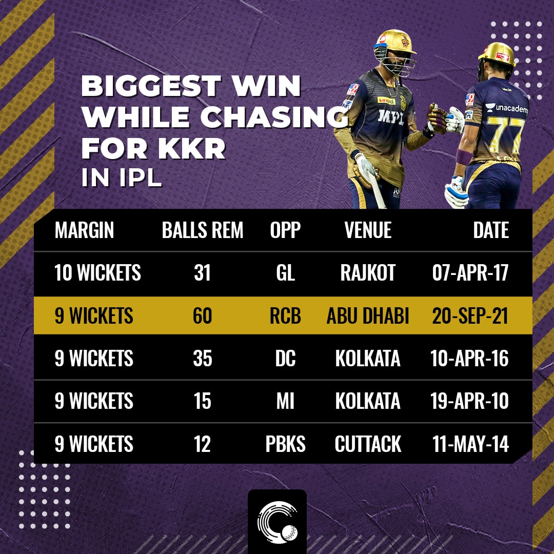 Kolkata played their first match and their 200th match in IPL against Bangalore. In both the matches, Kolkata stormed their way to a win. In the first, it was while defending and in their 200th while chasing and in both the matches they recorded their biggest wins in IPL. A 140-run win in 2008 and in 2021, a nine-wicket win with 60 balls to spare. In terms of balls remaining this is their biggest win. While chasing overall, this is their biggest after their 10-wicket win against the now-defunct Gujarat Lions in 2017.