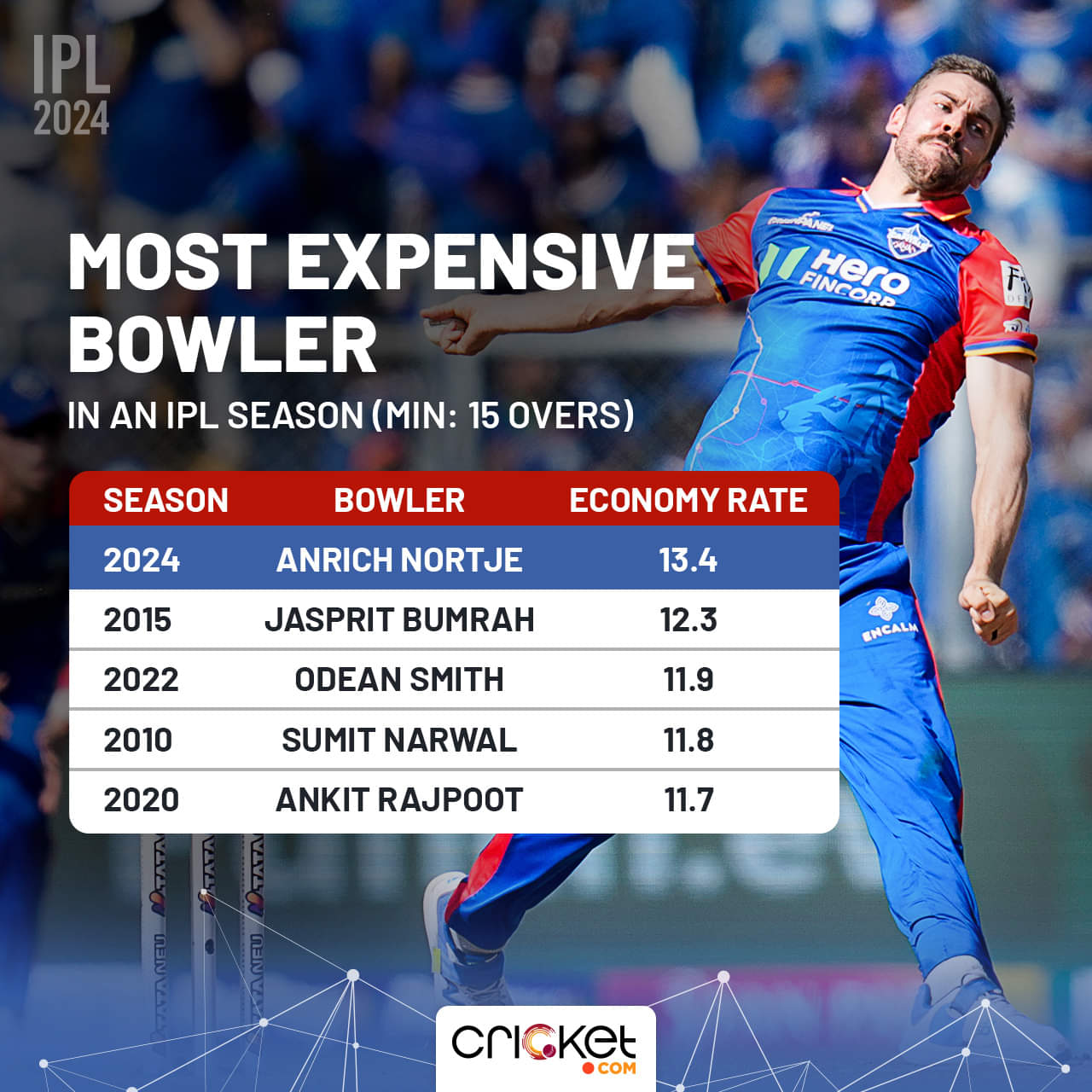 As things stand, Anrich Nortje is the most expensive bowler in a campaign ACROSS SEASONS in the IPL with an economy rate of 13.4 (Min: 15 overs). Surprisingly, the second on the list is Jasprit Bumrah, who, in 2015, went for 12.3 runs in an over.