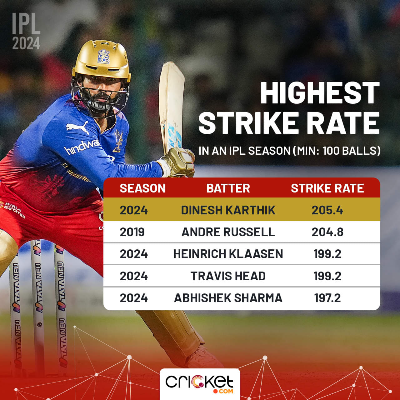 Dinesh Karthik is on course to become the batter with the highest strike rate in an IPL season (minimum 100 deliveries).