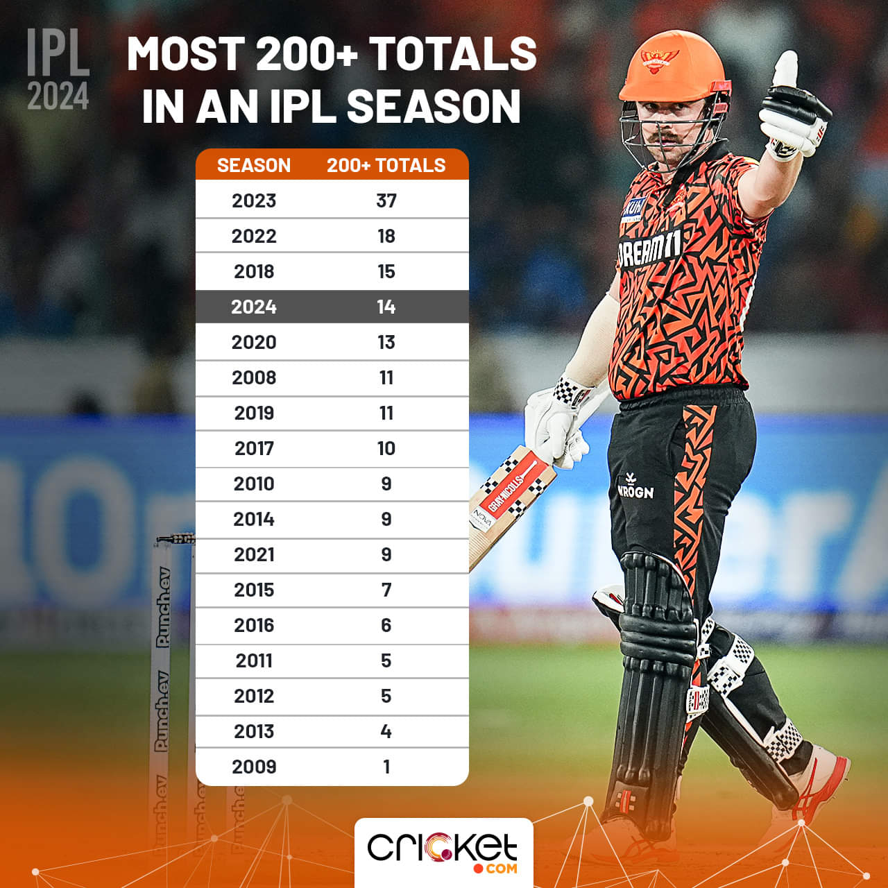 As many as 37 totals over 200 were scored in 2023, which is a record – pipping the 18 times double century was breached in 2022. Will we see a new record set in 2024? In the 32 matches so far, a total of 200 or more has been hit on 14 occasions, which is already more than 13 previous IPL seasons.