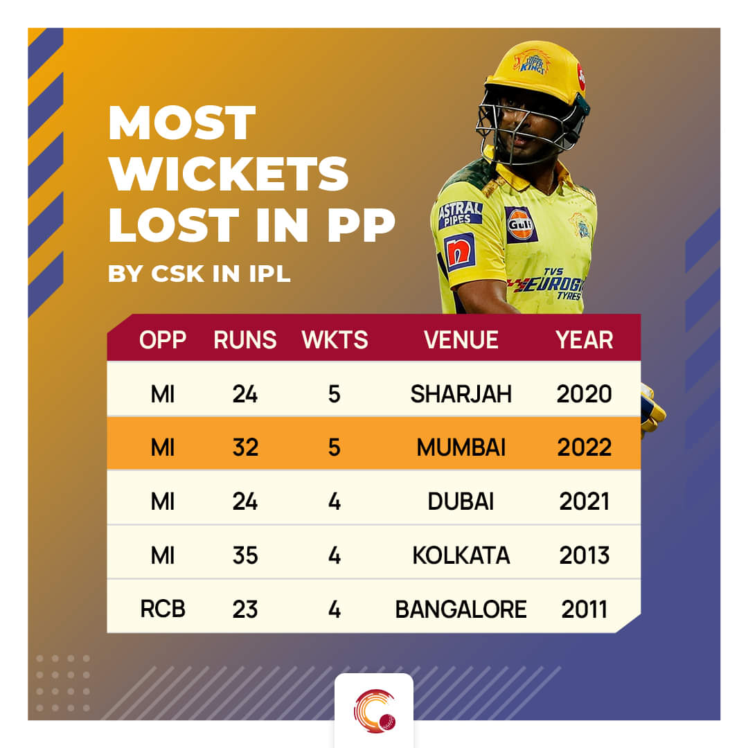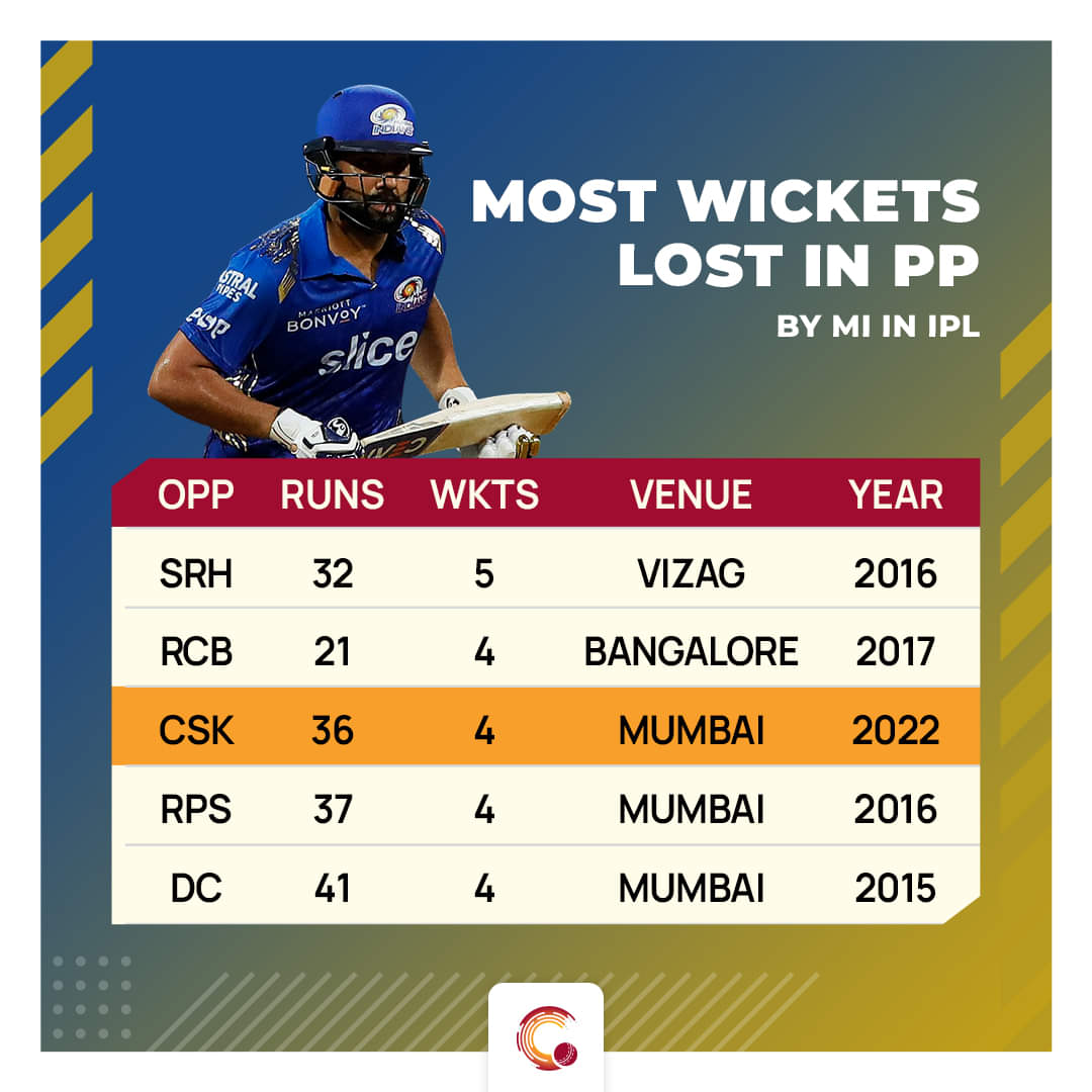 Their horrific display with the bat at the Wankhede was the second-worst powerplay score for them across all the seasons. In 2020 at the Sharjah Cricket Stadium, they endured a similar outing and managed to crawl their way to 24 for the loss of five wickets, which is their worst powerplay performance.