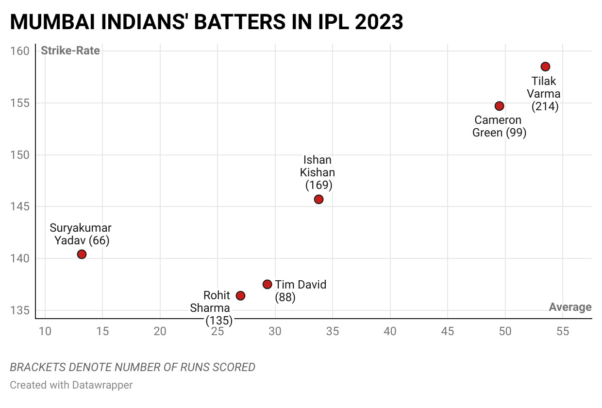 Mumbai have a dodgy batting arsenal this season. None of their batters walked into the tournament in top form. To accommodate their new ‘million dollar’ baby Cameron Green, they had to move Tilak down the order, shifting him away from his preferred batting position.