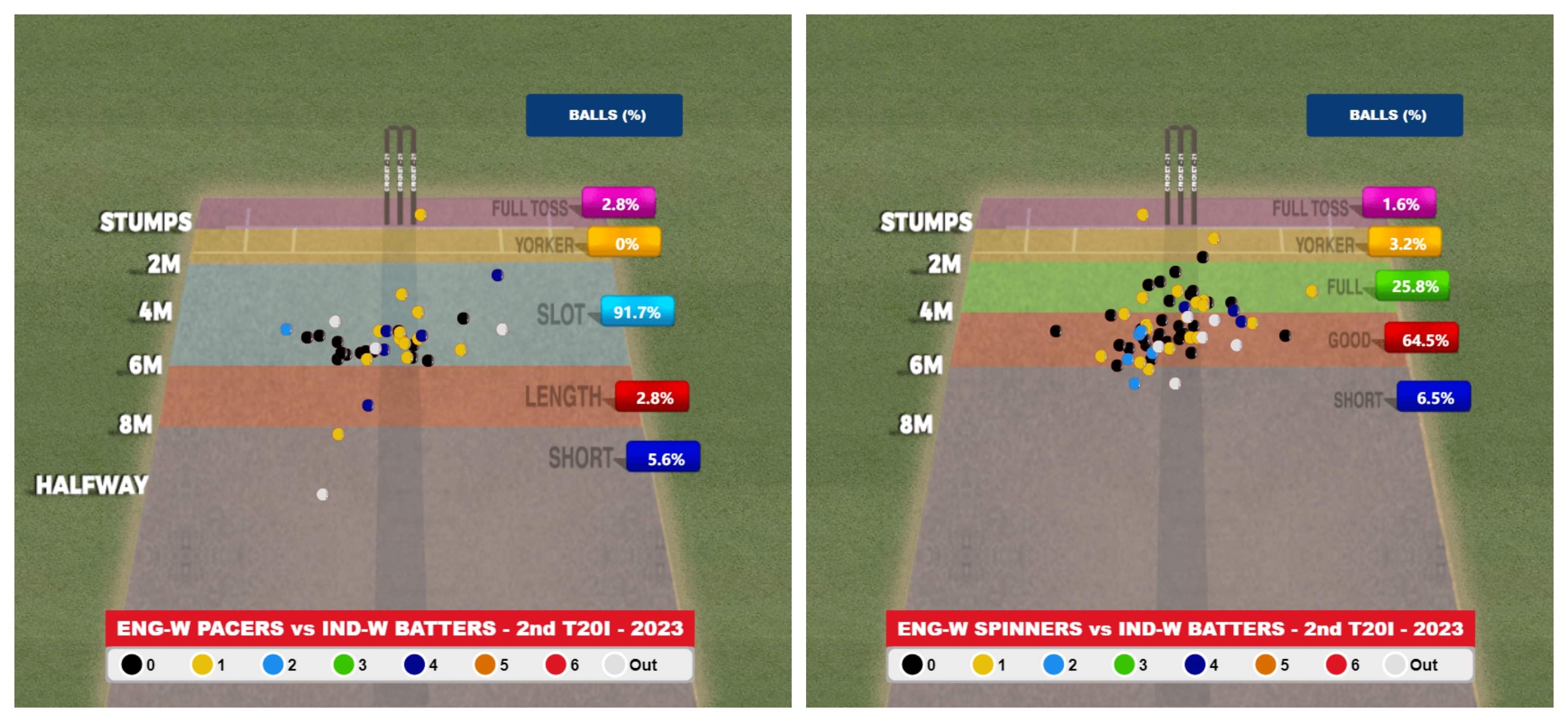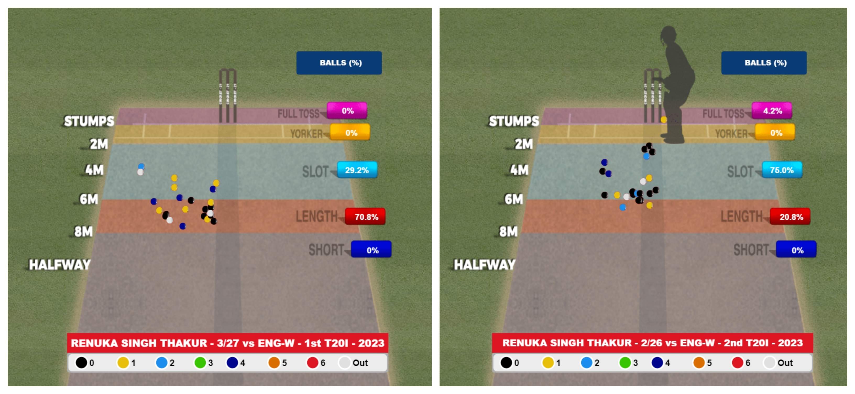 While she bowled a tad wider in the first game, drawing the batter forward more often than not, she bowled pretty much on the wickets in this game with a bit of swing aiding her efforts. All her four powerplay wickets in the series have bowled the batter, further underlying her relentless accuracy.