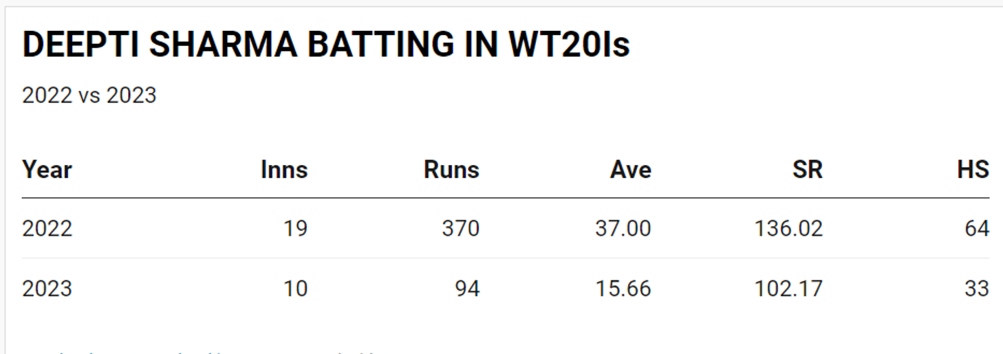 Deepti Sharma’s 2023 is getting from bad to worse, especially with the bat. The role she does with the bat is not an easy one as she gets moved around quite a bit. She has been entrusted to bat everywhere between five and eight over the last two years, but has not been able to match the highs she had in 2022.