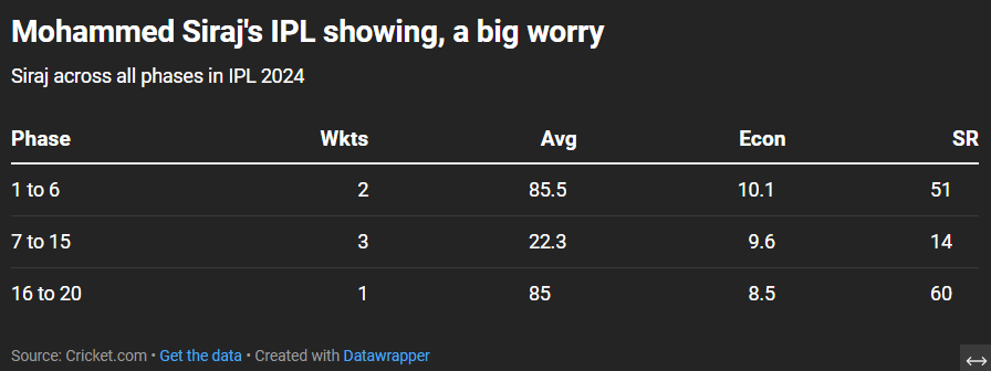 If the recent form is anything to go by, then India would be concerned with the form of Mohammed Siraj. Siraj has picked up only two wickets during the first six overs in the IPL 2024 and has conceded runs at 10.1 in the powerplay stage.