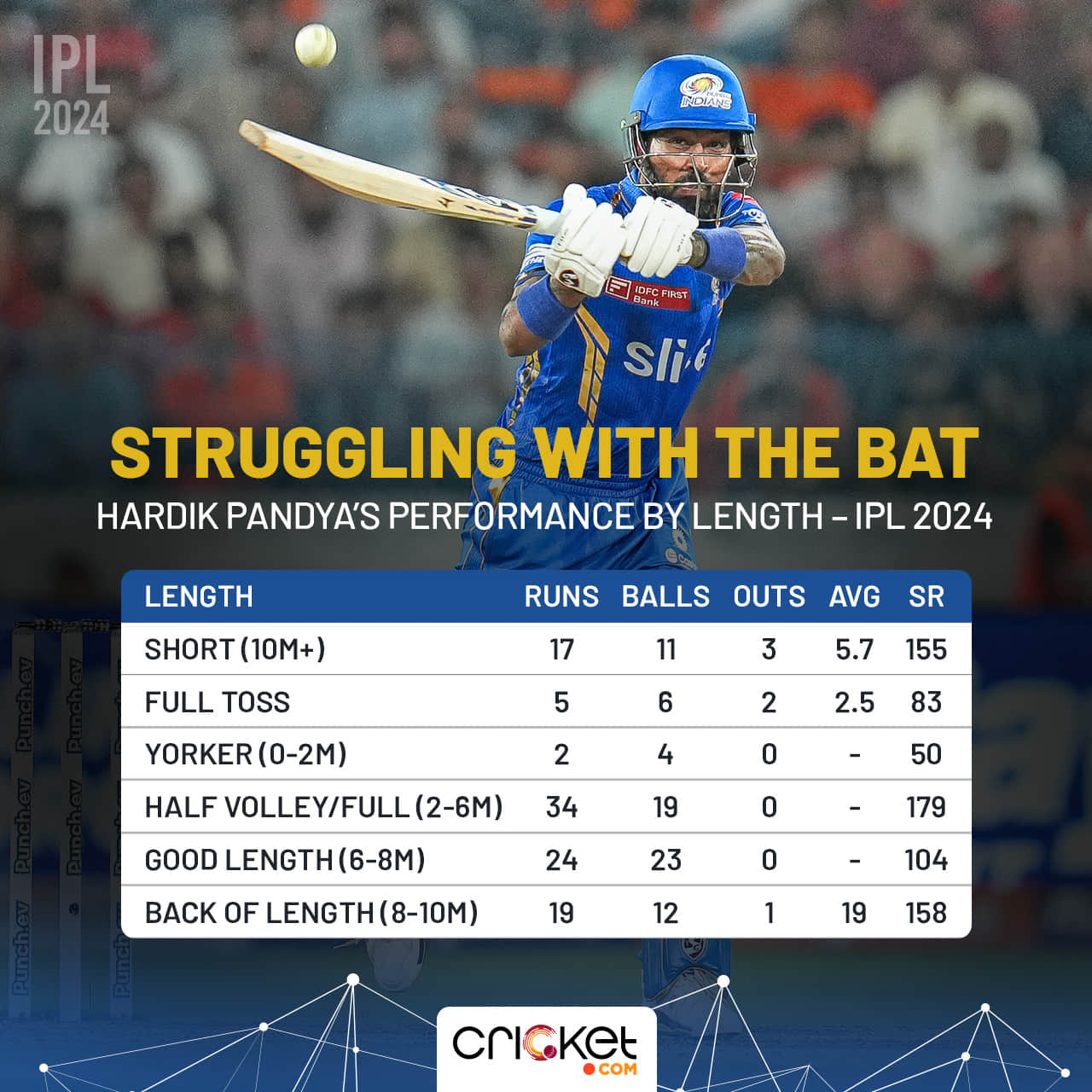 Against full tosses, too, Pandya doesn’t have great numbers (Avg 5, SR 125). The same with Jadeja (SR 126.7), scoring 19 off 15.