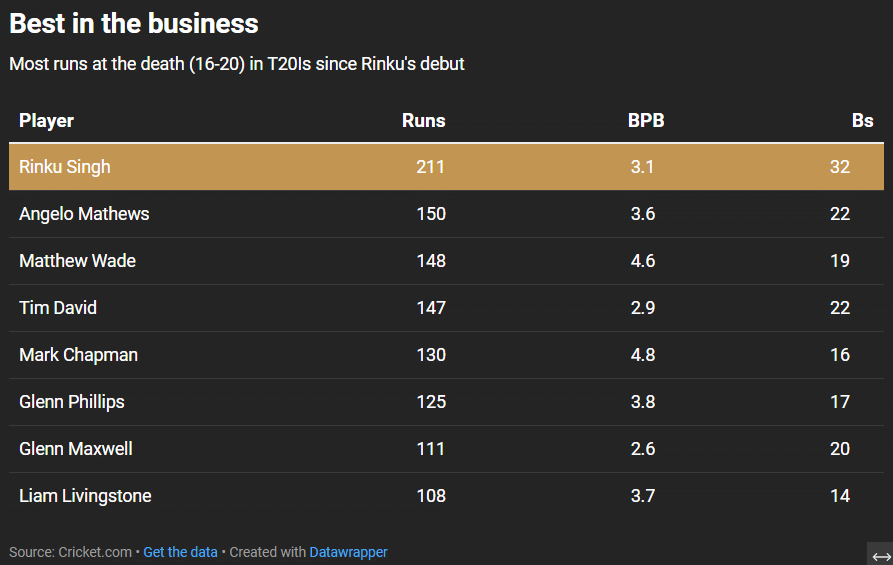 Since Rinku Singh’s India debut, no other player from the top ten teams have scored as many runs as him. The left-hander has scored 211 runs in ten innings at the death, with 32 boundaries, the most.