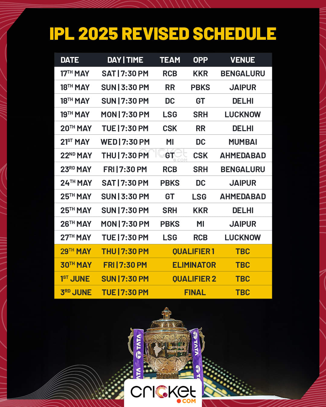 The Board of Control for Cricket in India (BCCI) has announced the new schedule for the remainder of the 2025 season of the Indian Premier League (IPL) after consultations with security agencies, all the main stakeholders and the government. The season will restart from May 17 and will end with the final scheduled on June 3.