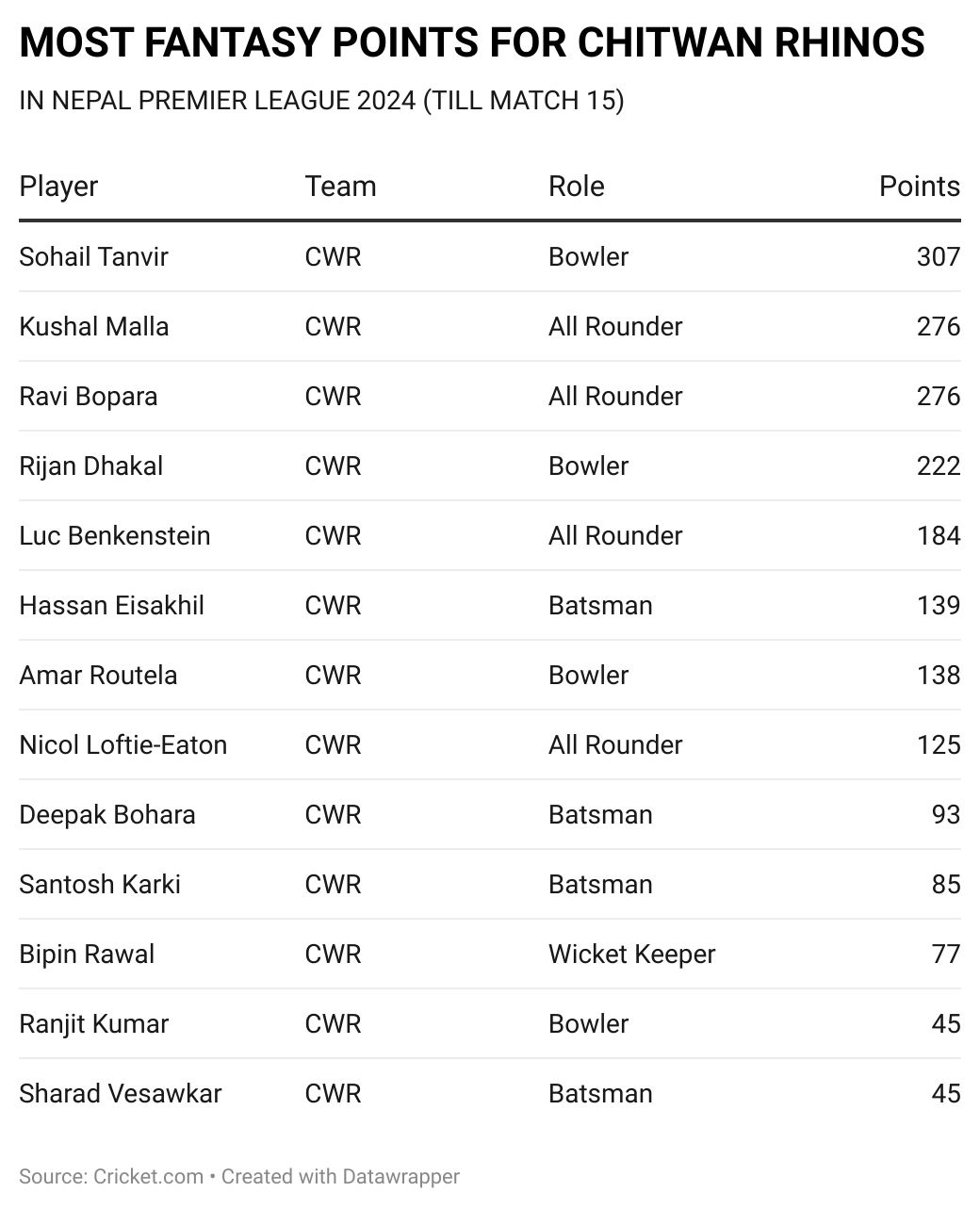 Sohail Tanvir has the most points for the Chitwan Rhinos. Overall, he has the third most after the first 15 games, with only Harsh Thaker (312) and Rohit Paudel (358) securing more points.
