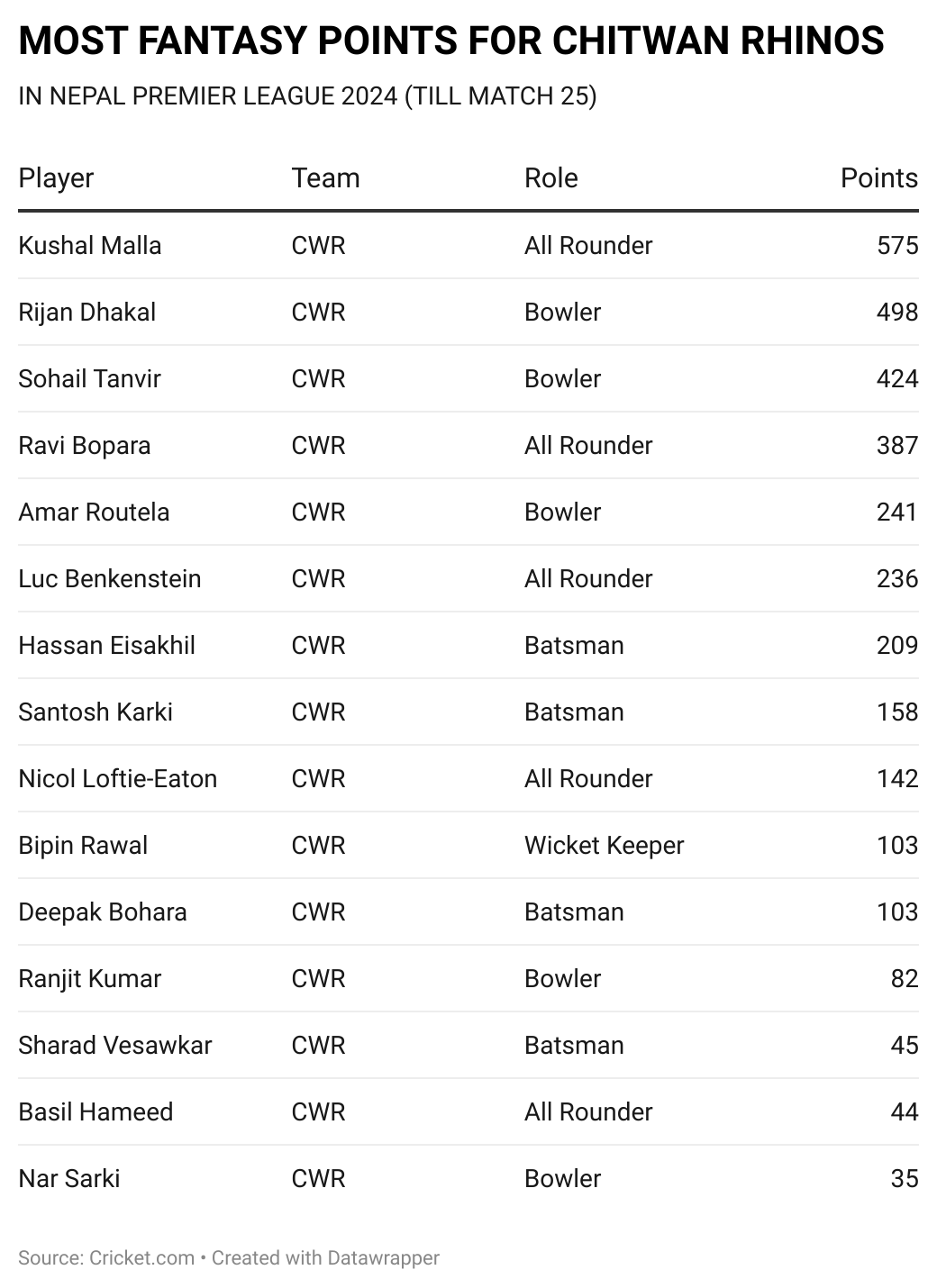 After registering two wins in the first two matches, Chitwan Rhinos managed to win just one of the next four games, but their net run rate never took a big hit. They won their last fixture, which has put them in a good position to qualify for the playoffs.