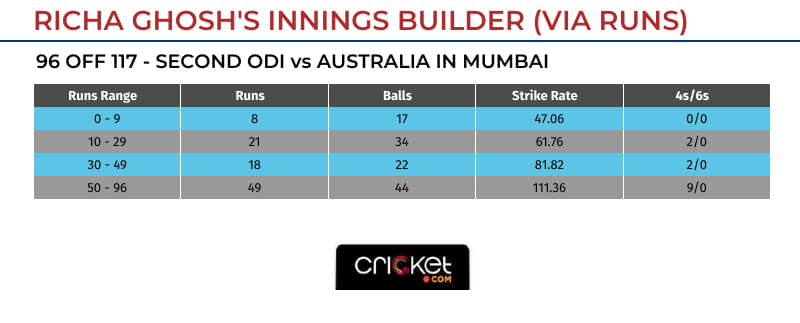This was only her second knock at No. 3, however, Richa crafted her innings like she has been batting in the top-order for years. The likes of Darcie Brown, Kim Garth and Annabel Sutherland kept her quiet initially, with Richa even being dropped off the first delivery she faced. She only hit three fours in her first 60 deliveries, scoring just 37 runs.