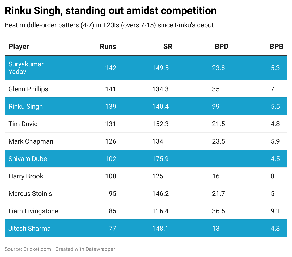 In fact, after facing 20 deliveries, Rinku scores a boundary every 2.8 deliveries, which decreases to just 2.3 after 30+ deliveries, showing that the left-hander has often played to the situation.