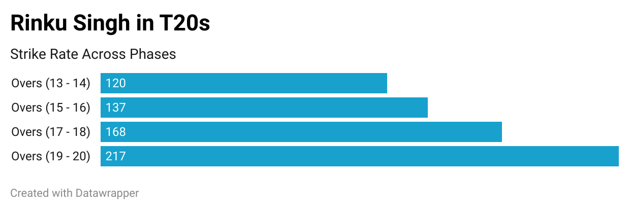 At #6, his expected entry point is usually post the 12th over. If we look at his strike rates post his entry point, it progressively goes up with each passing over, reaching stratospheric levels in the final two overs. Rinku scored over 150 runs at a strike rate of 233.8 in the 19th and 20th over when no other batter had hit more than 100 runs.