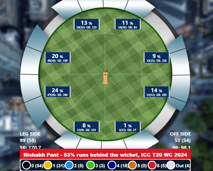 What was helping him to do that was also the fact that he was targeting areas of the ground that weren’t accessed by any other Indian batter this tournament. His sweeps (reverse, slog and paddle) allowed him to score 53% of his runs behind the wicket. He might have been dismissed twice while playing the reverse sweep, but he’s one of the few batters in the Indian batting lineup who actually plays that shot well.
