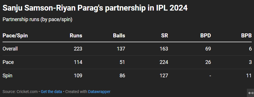 What was fascinating about their partnership was how they have taken the attack equally to both spin and pace. Against pace, the duo have struck at 223.5, with 114 off just 51 balls. Meanwhile, against spin, Parag and Samson have been very respectful, with just 109 off 86 deliveries.
