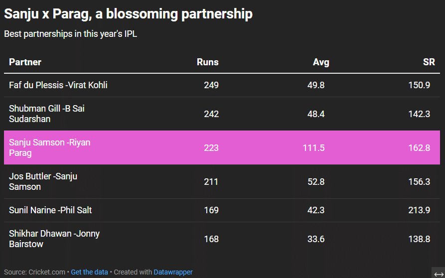 The partnership has amassed 223 runs in just two innings, only behind Faf du Plessis-Virat Kohli (249 runs) and Shubman Gill-Sai Sudharsan (242 runs). But when it comes to the strike rate, it is clear as daylight that there’s no other better partnership as consistent as Samson-Parag, who scored at 162.8.