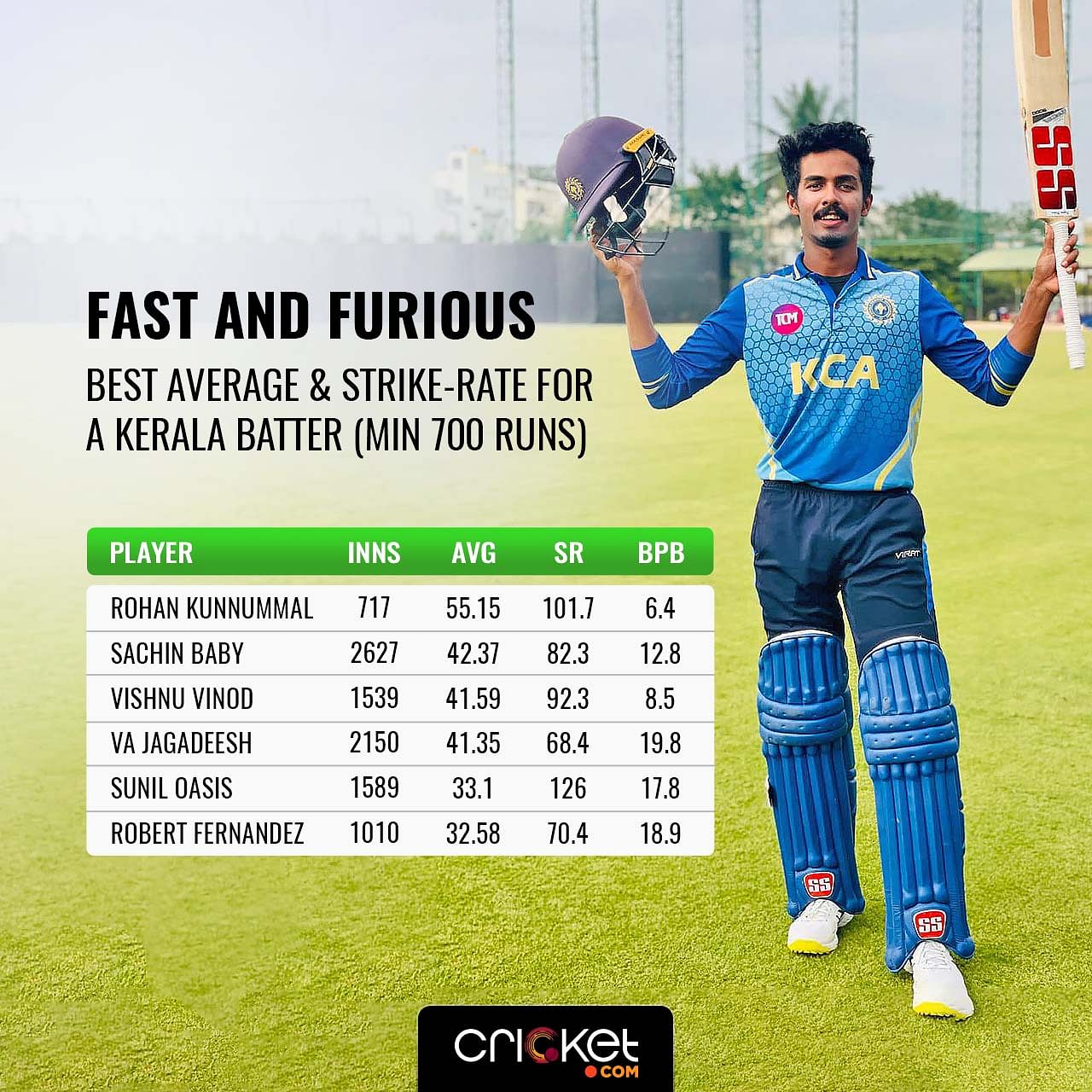 All of this while still striking at 81.81 on some of the toughest wickets in the country. Even at the List-A level, the 25-year-old from Kozhikode went past the 1000-run mark, averaging 57.11 and striking at 107.53 - the best numbers for anyone with a minimum of 1000 runs from the state.
