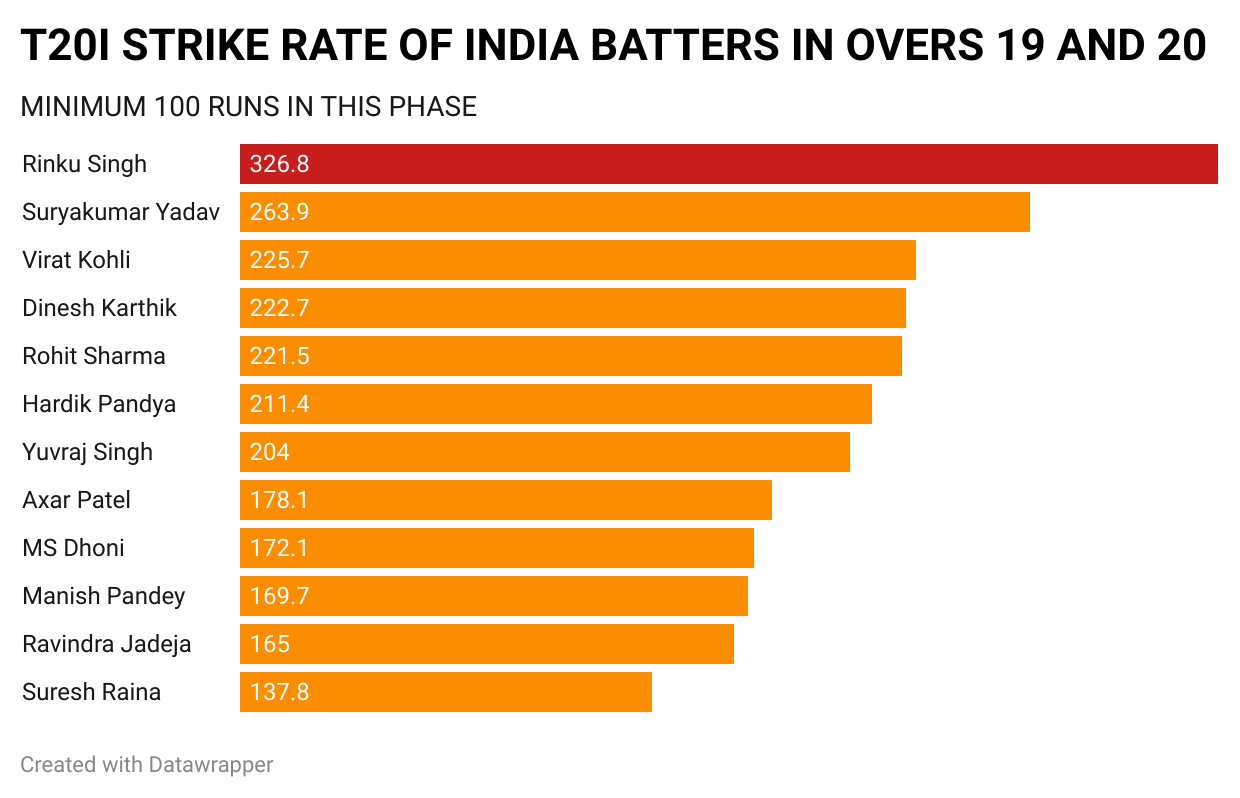 Only 12 Indian batters scored over 100 runs in this brief phase. Rinku’s strike rate of